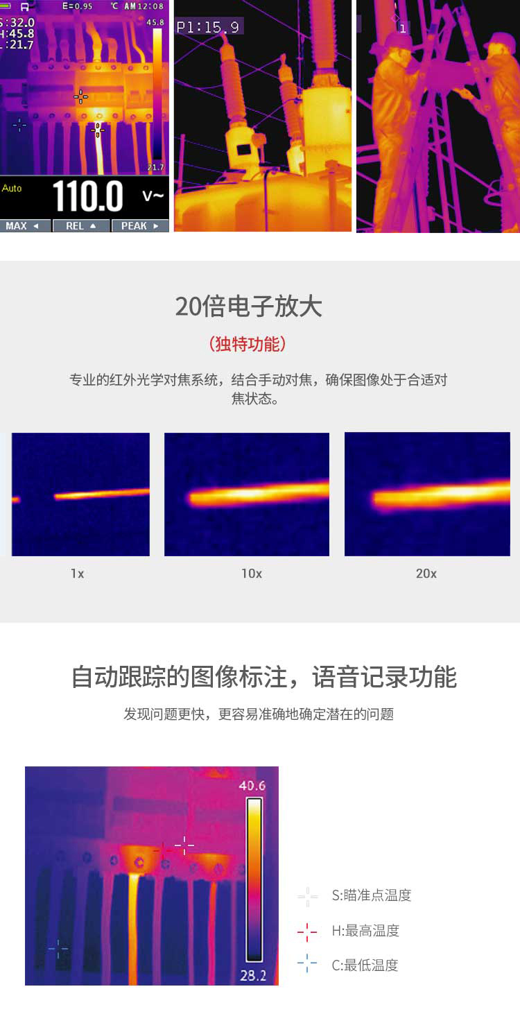 標配鏡頭7.5mm,分辨率160×120,IFOV:3.33mard,視場角29.8×22.6°,熱靈敏度NETD<0.08℃,圖像幀頻50Hz,溫度范圍(-20-150、0-400),可見光分辨率640×480像素