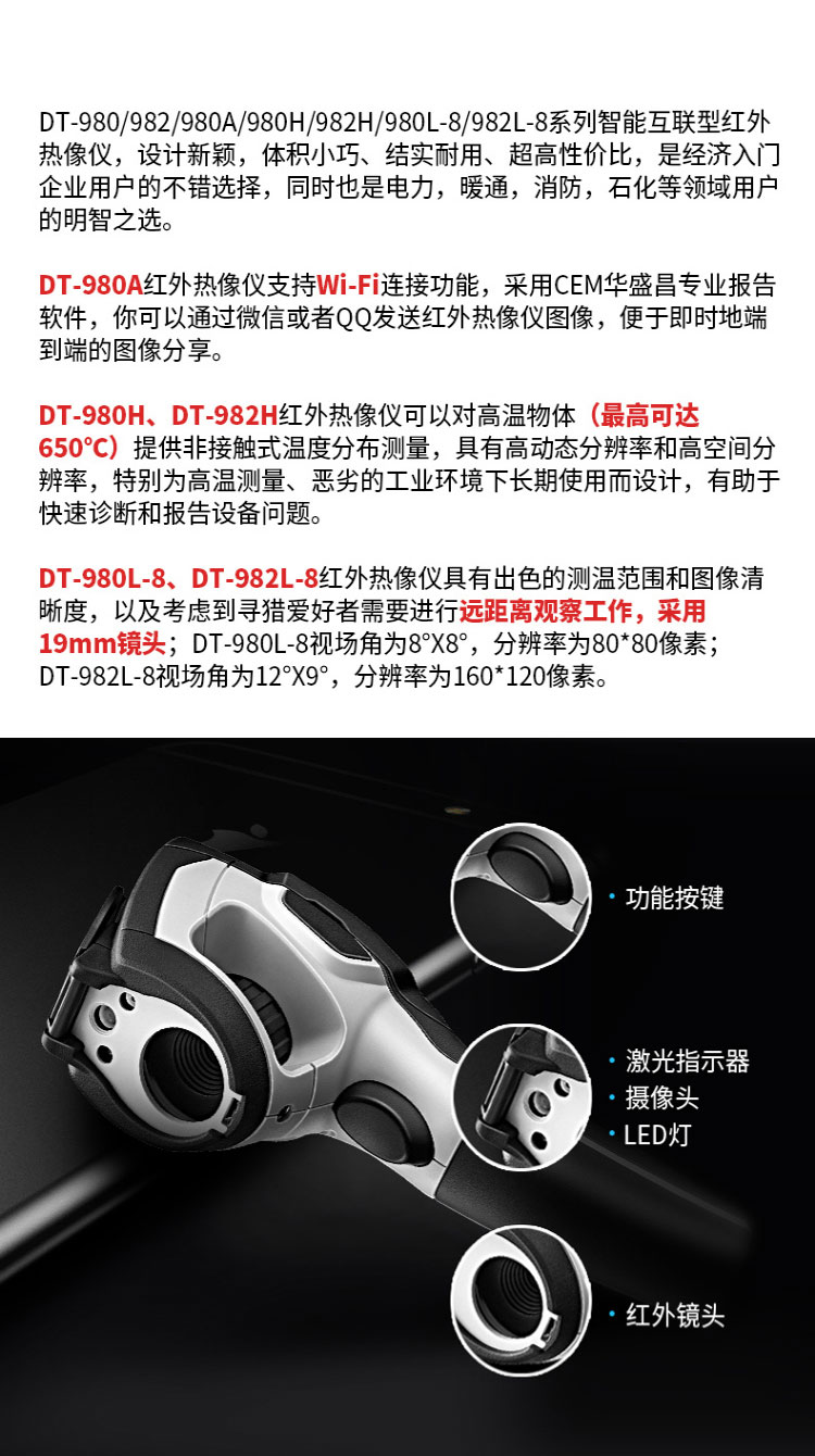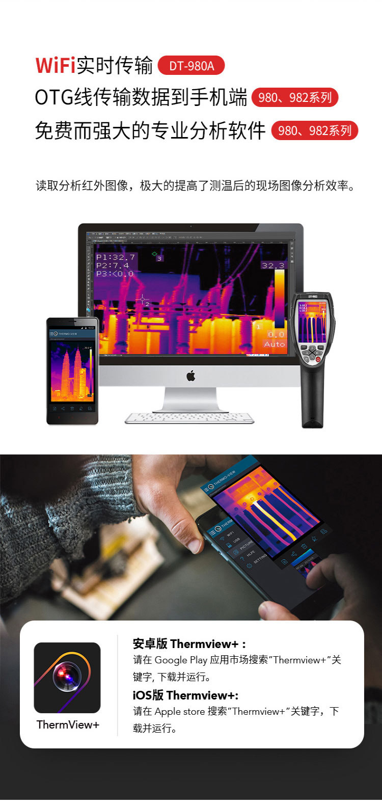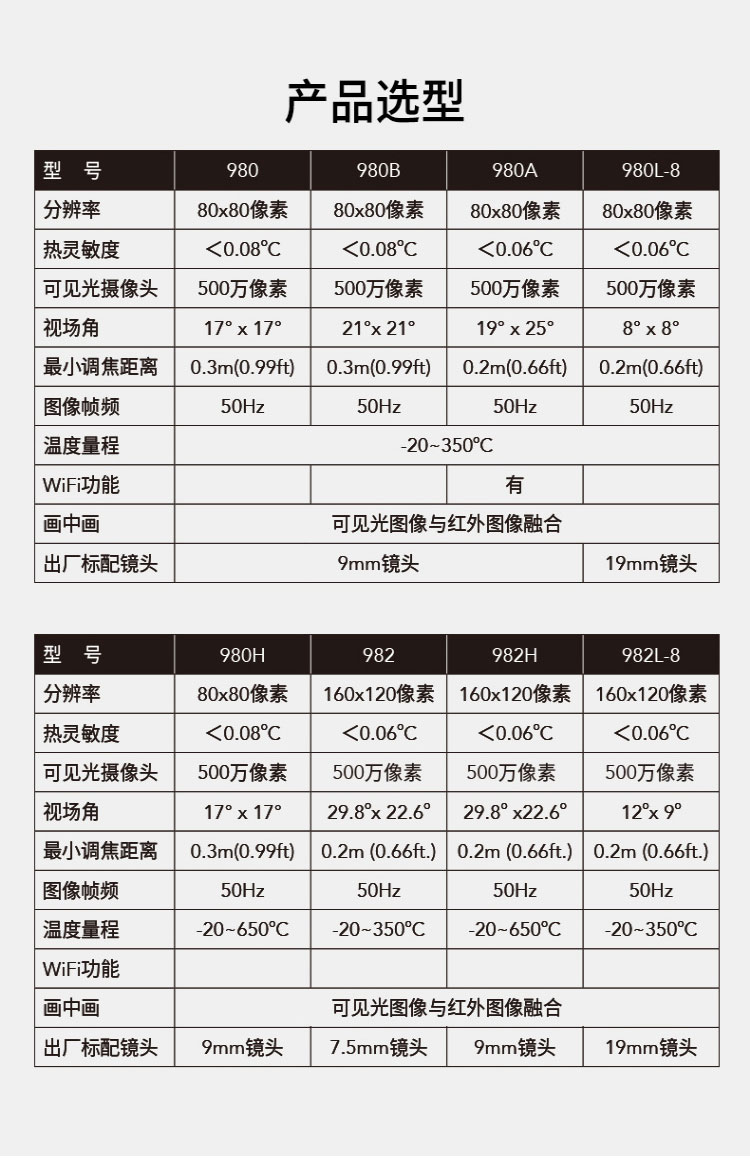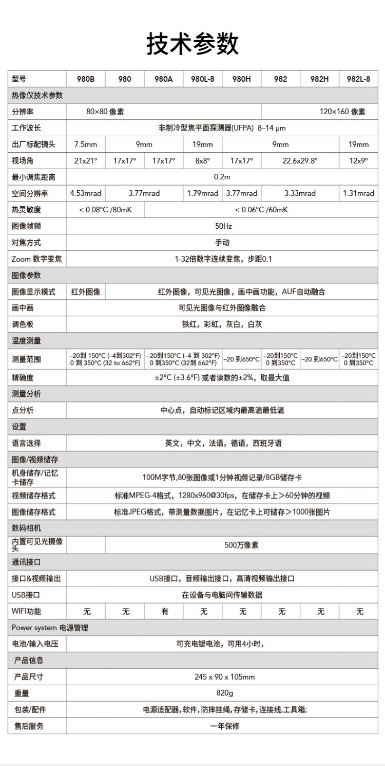 標(biāo)配鏡頭7.5mm,分辨率80×80,IFOV:3.77mard,視場(chǎng)角17×17°,熱靈敏度NETD<0.06℃,圖像幀頻50Hz,溫度范圍(-20-150、0-650),可見光分辨率500萬像素