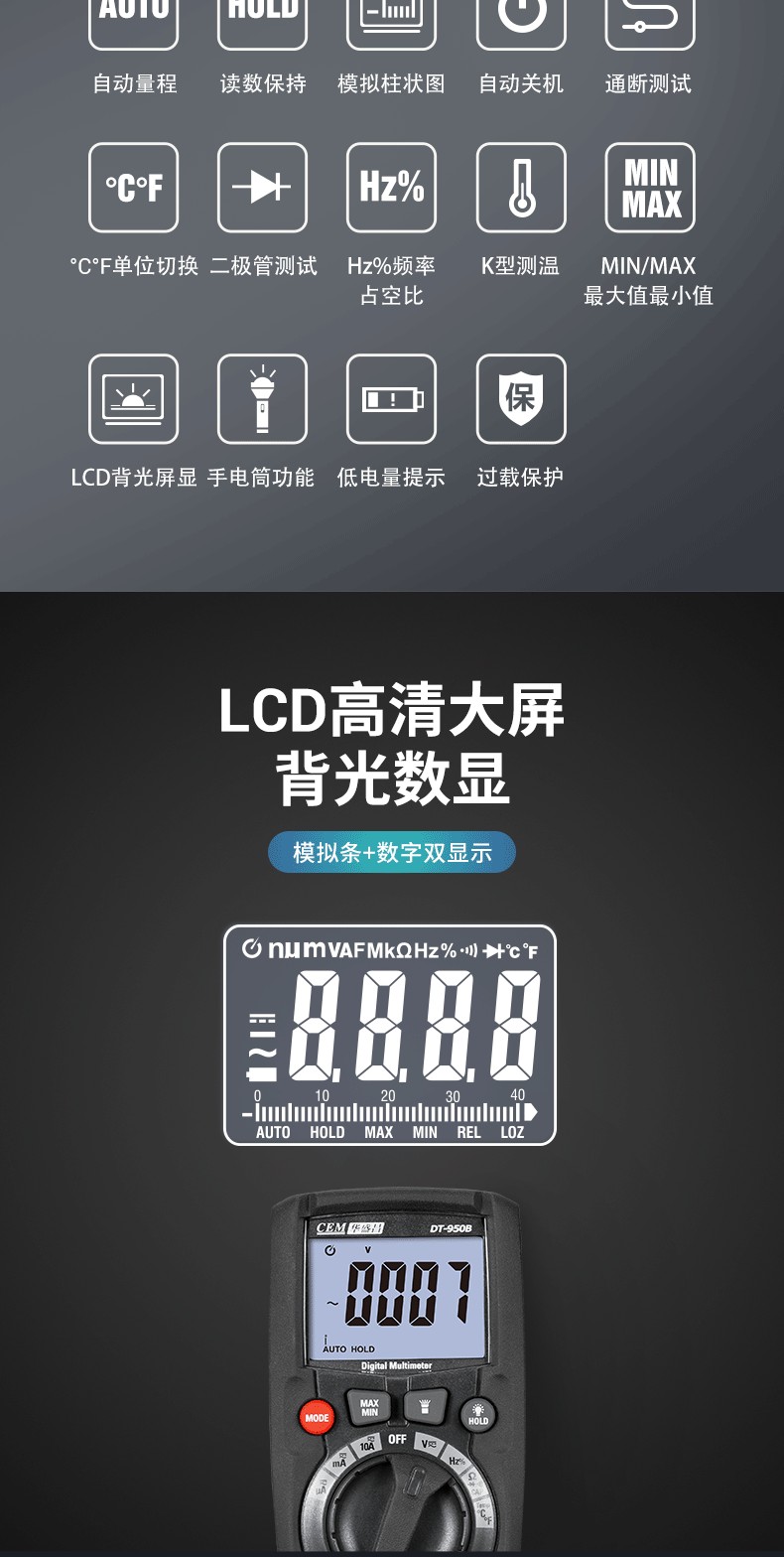 數(shù)字萬用表,一種多用途電子測量儀器,一般包含安培計、電壓表、歐姆計等功能,有時也稱為萬用計、多用計、多用電表,或三用電表。 數(shù)字萬用表適用于基本故障診斷的便攜式裝置,也有放置在工作臺的裝置,有的分辨率可以達(dá)到七、八位。 數(shù)字多用表(DMM)是在電氣測量中要用到的電子儀器。它可以有很多特殊功能,但主要功能就是對電壓、電阻和電流進行測量,數(shù)字多用表,作為現(xiàn)代化的多用途電子測量儀器,主要用于物理、電氣、電子等測量領(lǐng)域。