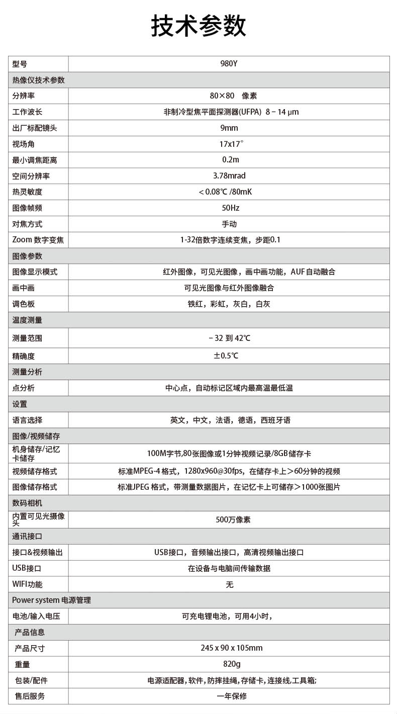 分辨率:80*80、圖像幀頻:50HZ、篩查測溫范圍:32-42℃、可外接HDMI大屏顯示