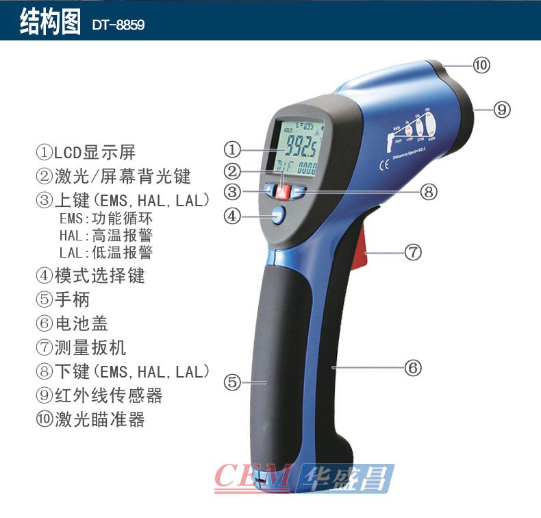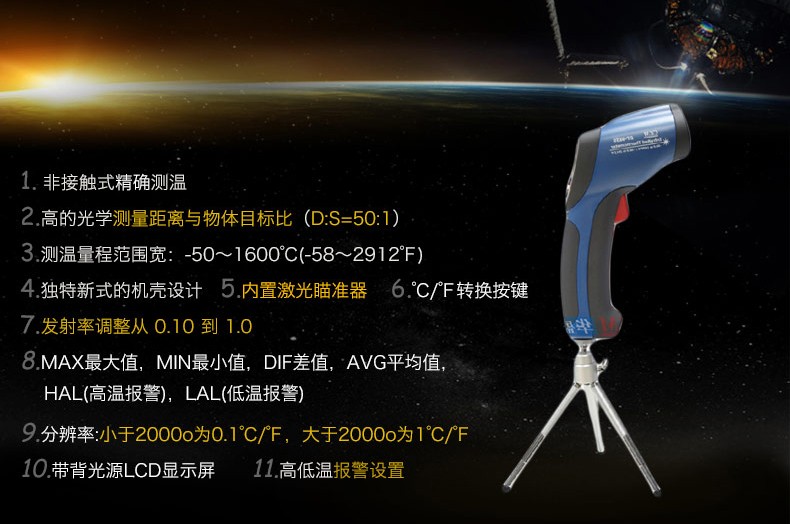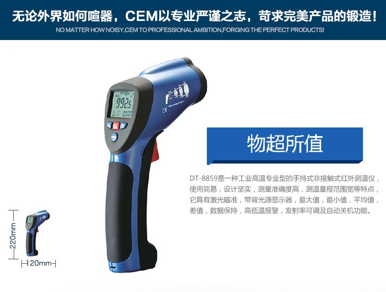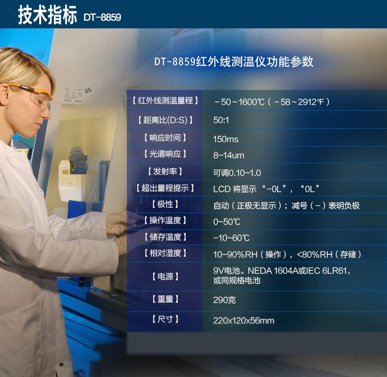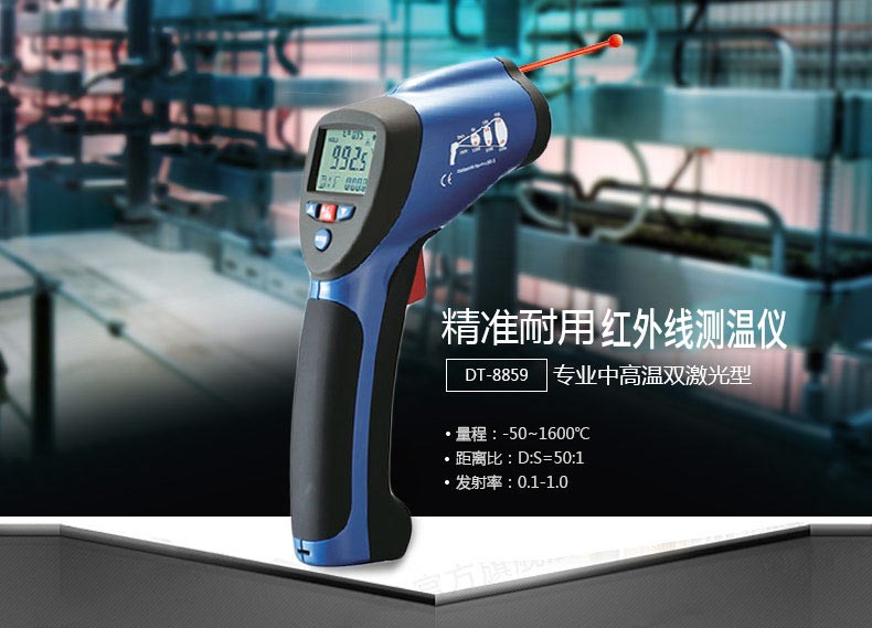 DT-8829紅外線測溫儀一種專業(yè)型的手持式非接觸紅外線測溫儀,使用簡易,設(shè)計堅(jiān)實(shí),測量準(zhǔn)確度高,測溫量程范圍寬等特點(diǎn)。它具有激光瞄準(zhǔn),帶背光源顯示器,最大值,最小值,平均值,差值,數(shù)據(jù)保持,高低溫報警,發(fā)射率可調(diào)及自動關(guān)機(jī)功能。該手持式非接觸紅外線測溫儀可用于測量那些不適合使用傳統(tǒng)接觸式測量方法來測量物體的表面溫度(例如移動物體,帶電表面和難以接觸到的物體)。特征:非接觸式精確測溫高的光學(xué)測量距離與物體目標(biāo)比(D:S-16;1/50:1)測溫量程范圍寬獨(dú)特新式的機(jī)殼設(shè)計內(nèi)置激光瞄準(zhǔn)器自動數(shù)值保持℃/F轉(zhuǎn)換按鍵發(fā)射率調(diào)整從0.10 到1.0,(8829固定在0.95)MAX,MIN,DIF,AVG 溫度顯示帶背光源LCD顯示屏自動選擇量程,分辨率為0.1